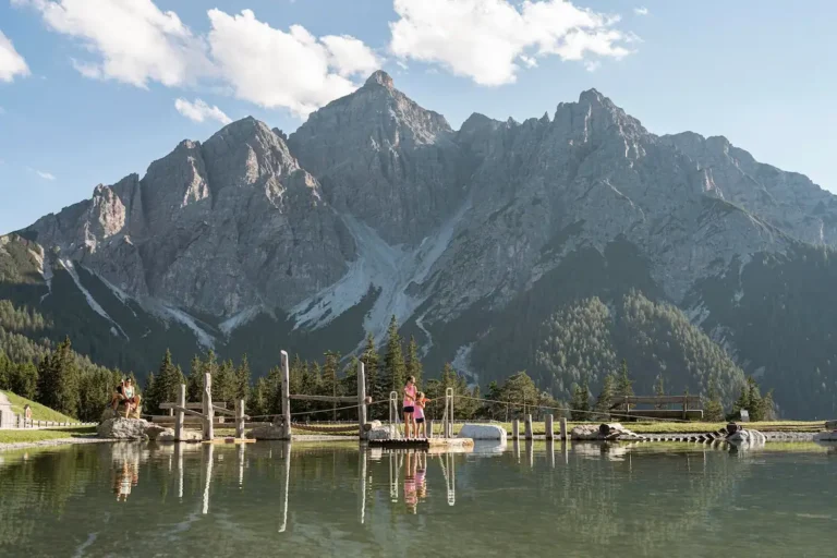 Se accede en teleférico y arriba hay un gran lago alpino con estructuras de madera, columpios, zonas de agua y vistas espectaculares a los Alpes tiroleses.